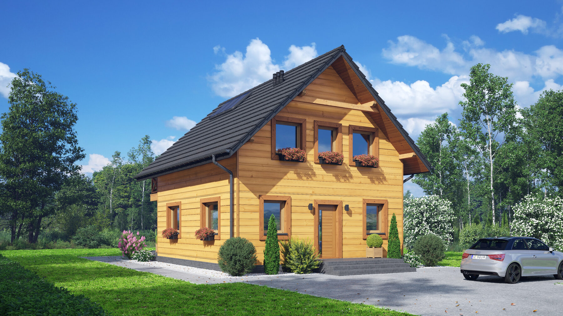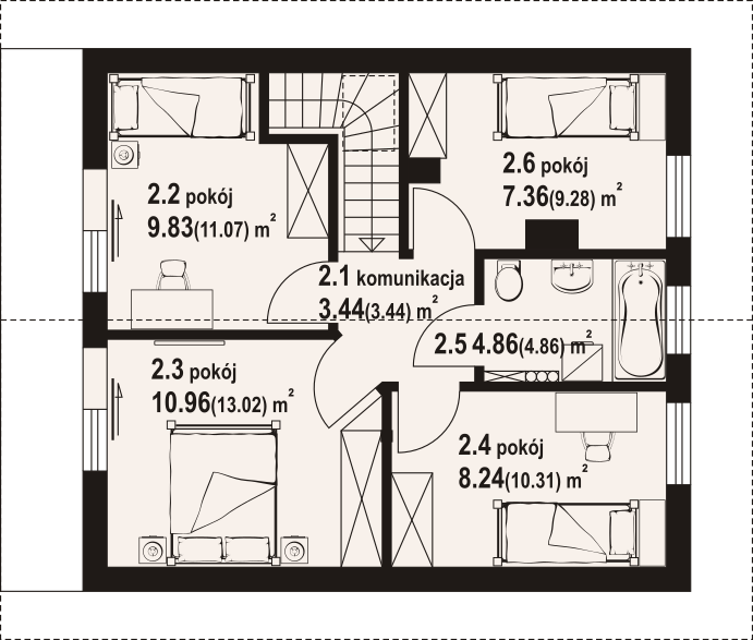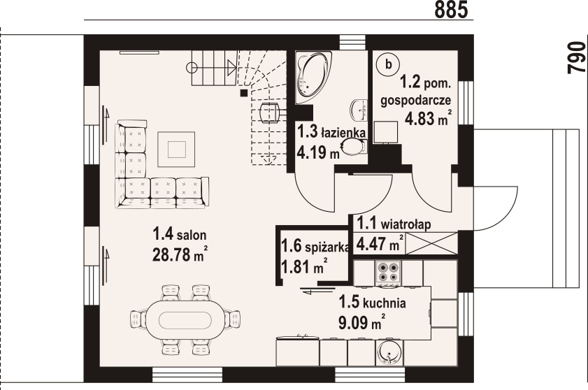 Dom w konstrukcji szkieletu drewnianego. Na parterze salon z kuchnią, wyjściem na taras i schodami na poddasze. Spiżarka, wiatrołap, łazienka, kotłownia. Na poddaszu cztery pokoje, łazienka, komunikacja oraz balkon dostępny z dwóch pokoi. Zwarta bryła budynku oraz dach dwuspadowy sprzyjają szybkiej i taniej budowie oraz niskim kosztom eksploatacji.