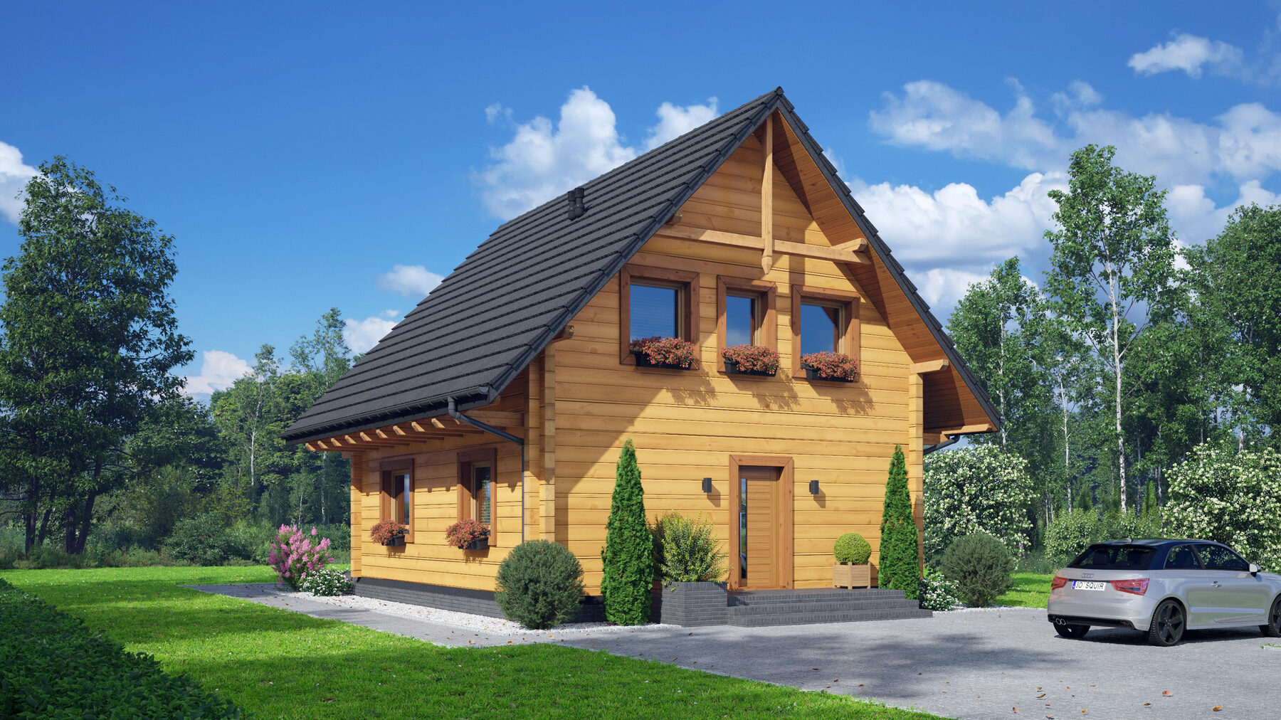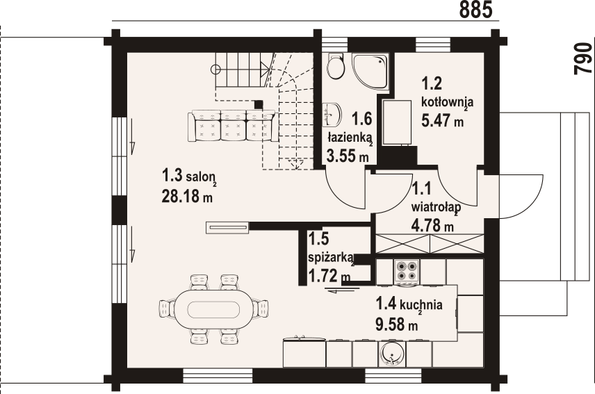 Dom z bali. Na parterze salon z otwartą kuchnią, wyjściem na taras i schodami na poddasze. Spiżarka, łazienka, kotłownia, wiatrołap. Na poddaszu cztery pokoje, łazienka, komunikacja oraz balkon dostępny z dwóch pokoi. Zwarta bryła budynku oraz dach dwuspadowy sprzyjają szybkiej i taniej budowie oraz niskim kosztom eksploatacji.