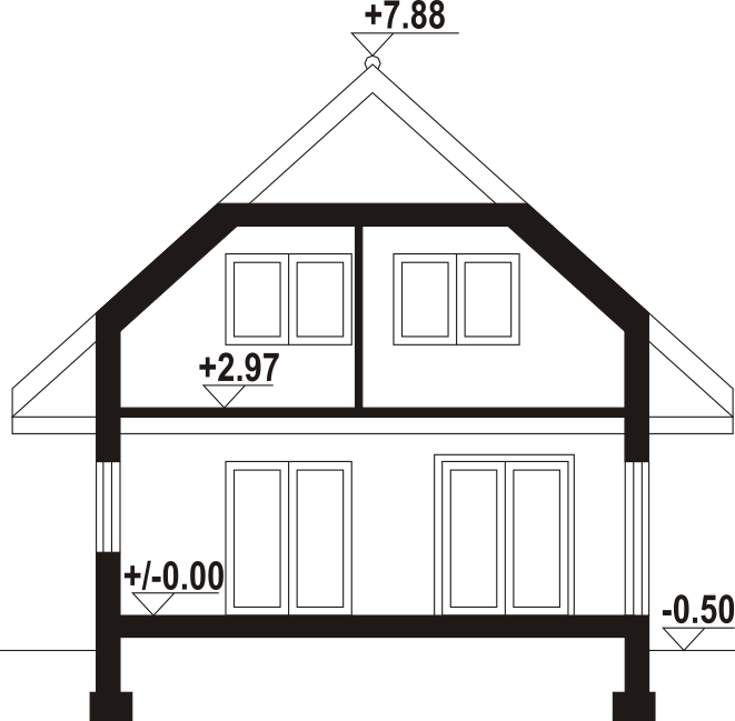 Dom w konstrukcji szkieletu drewnianego. Na parterze salon z kuchnią, wyjściem na duży, zadaszony taras i schodami na poddasze. Spiżarka, łazienka, pomieszczenie gospodarcze, wiatrołap. Na poddaszu cztery pokoje, łazienka, komunikacja, Zwarta bryła budynku oraz dach dwuspadowy sprzyjają szybkiej i taniej budowie oraz niskim kosztom eksploatacji.