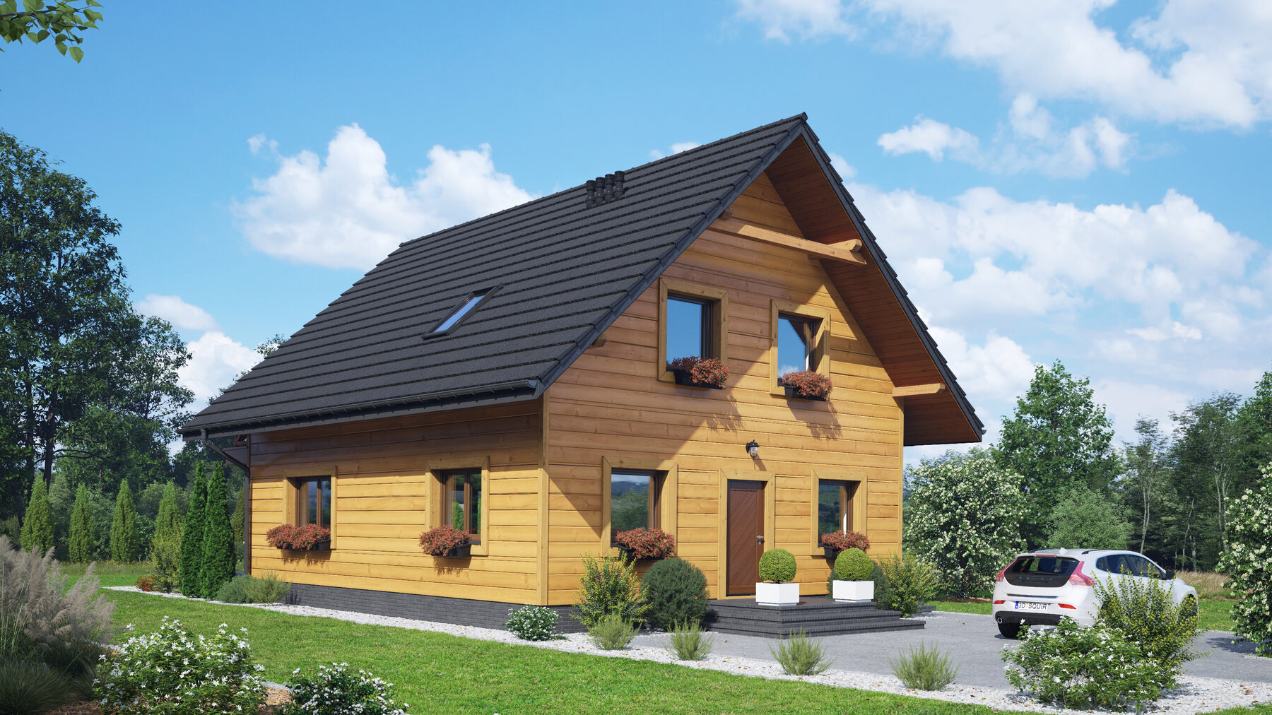 Dom w konstrukcji szkieletu drewnianego. Na parterze duży salon z wyjściami na taras i schodami na poddasze. Kuchnia, spiżarka, wiatrołap, łazienka, kotłownia. Na poddaszu trzy pokoje, dwie łazienki, dwie garderoby, komunikacja oraz balkon dostępny z dwóch pokoi. Zwarta bryła budynku oraz dach dwuspadowy sprzyjają szybkiej i taniej budowie oraz niskim kosztom eksploatacji.
