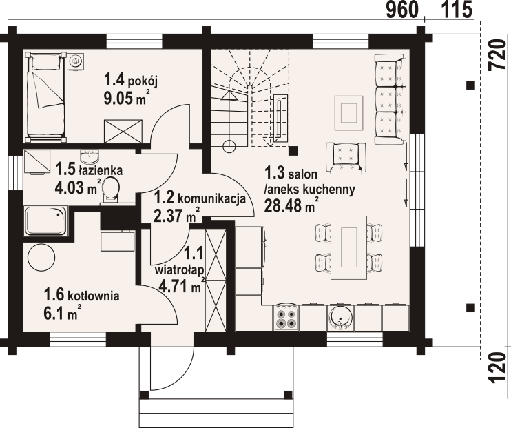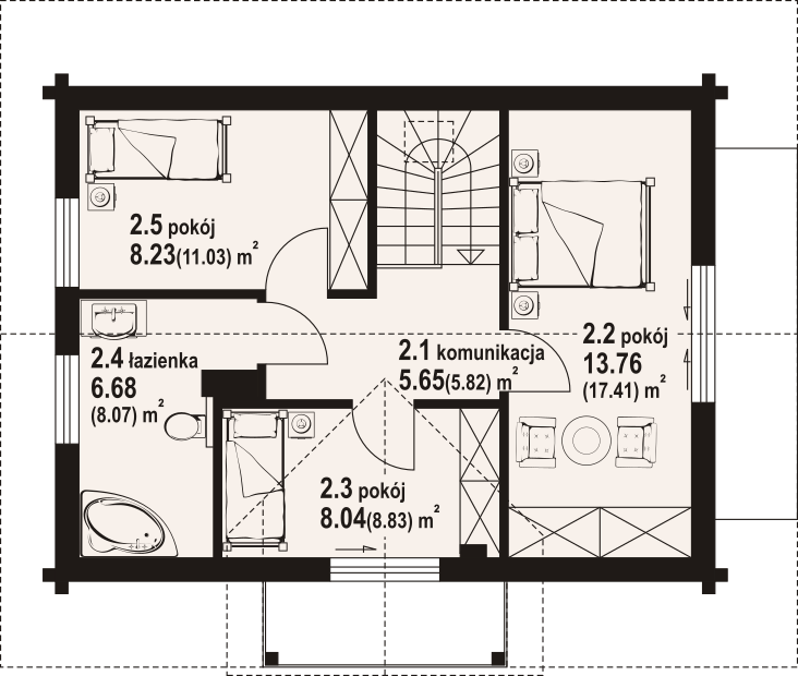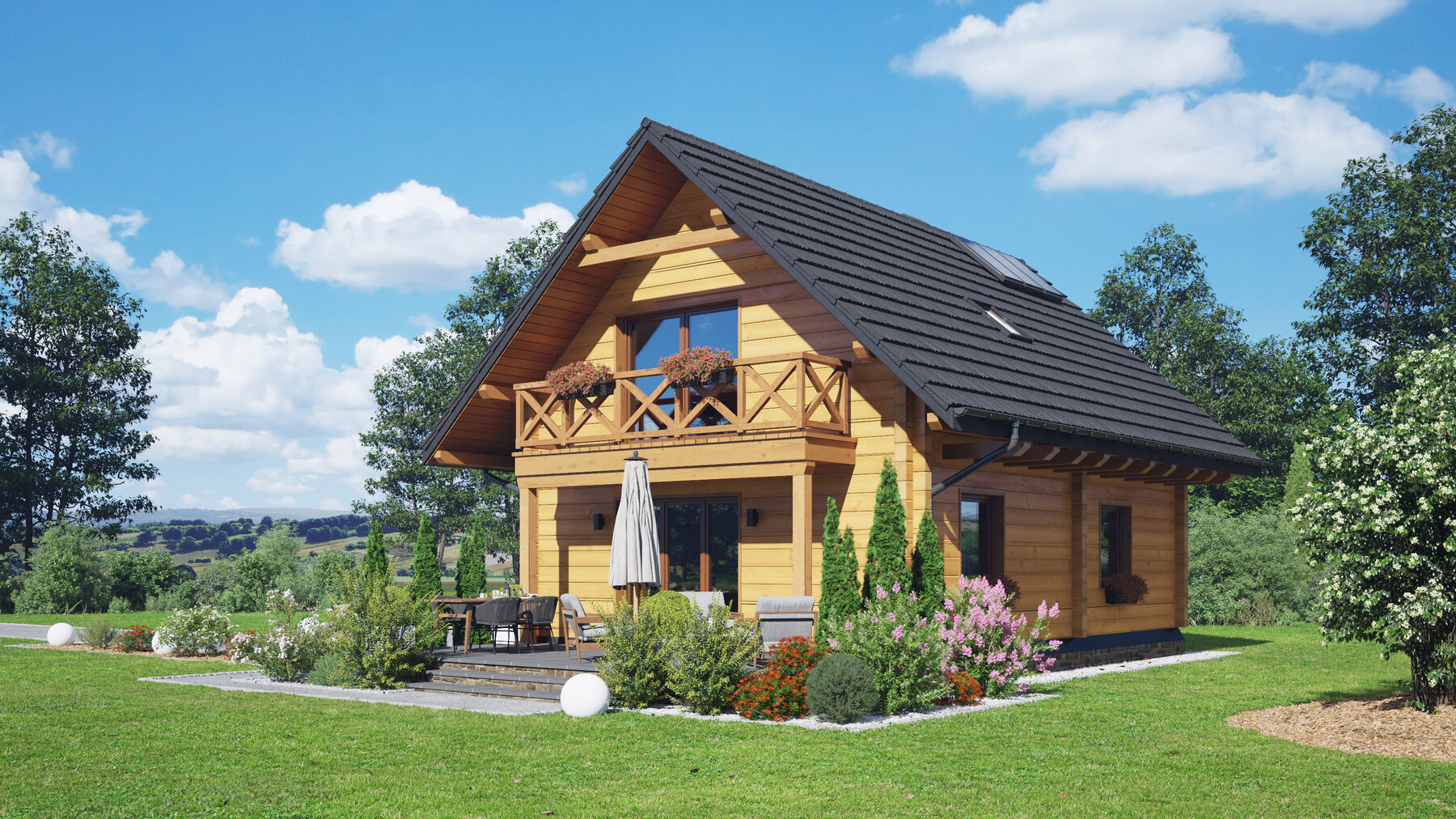 Dom z bali. Na parterze salon z aneksem kuchennym, wyjściem na taras i schodami na poddasze. Pokój, łazienka, kotłownia, wiatrołap, komunikacja. Na poddaszu trzy pokoje, łazienka, komunikacja. Dwa balkony. Zwarta bryła budynku oraz dach dwuspadowy sprzyjają szybkiej i taniej budowie oraz niskim kosztom eksploatacji.