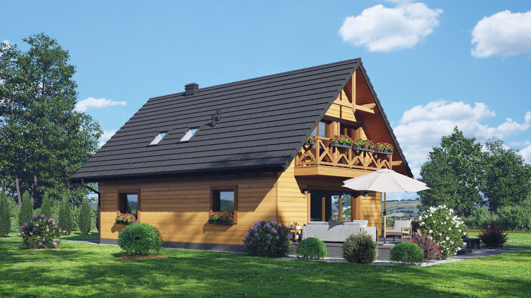 Dom w konstrukcji szkieletu drewnianego. Na parterze duży salon z aneksem kuchennym oraz wyjściem na taras. Pokój z własną łazienką, wc, kotłownia, wiatrołap. Na poddaszu trzy pokoje, dwie łazienki, garderoba, komunikacja, dwa balkony. Zwarta bryła budynku oraz dach dwuspadowy sprzyjają szybkiej i taniej budowie oraz niskim kosztom eksploatacji.