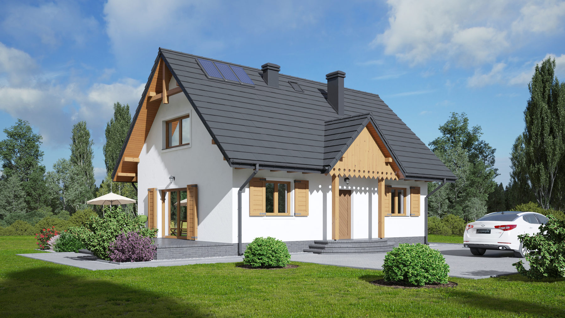 Dom w konstrukcji szkieletowej. Duży salon z aneksem kuchennym, kominkiem, wyjściem na taras i schodami na poddasze. Pokój, łazienka, kotłownia, wiatrołap i komunikacja. Na poddaszu trzy pokoje, łazienka, garderoba i komunikacja. Instalacja solarna. Zwarta bryła budynku i dach dwuspadowy sprzyjają szybkiej i taniej budowie i niskim kosztom eksploatacji.