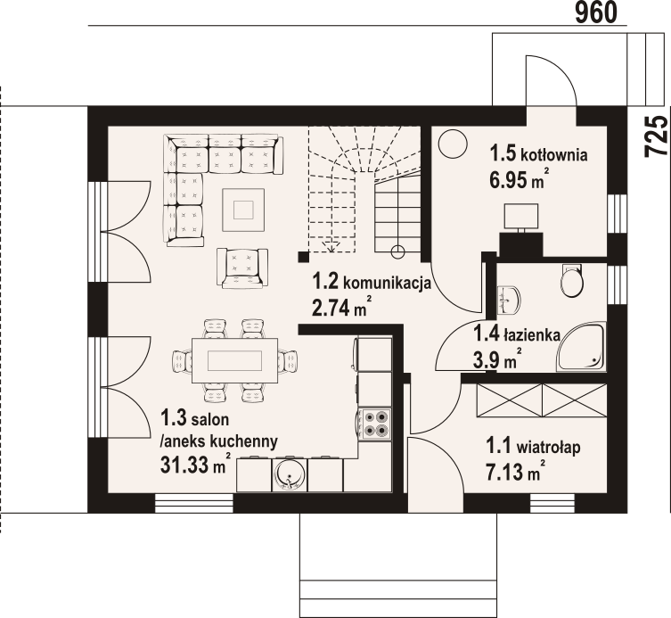 Dom z poddaszem użytkowym. Na parterze salon z aneksem kuchennym, wyjściem na taras i schodami na poddasze. Wiatrołap, łazienka, komunikacja oraz kotłownia. Na poddaszu trzy pokoje, wc, łazienka, komunikacja oraz balkon dostępny z dwóch pokoi. Zwarta bryła budynku oraz dach dwuspadowy sprzyjają szybkiej i taniej budowie oraz niskim kosztom eksploatacji.