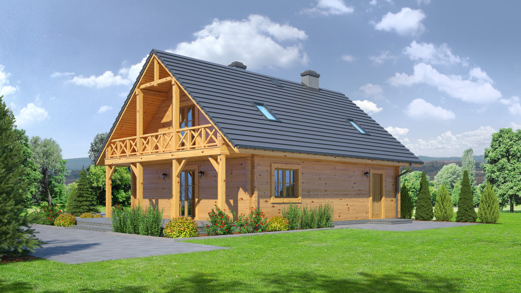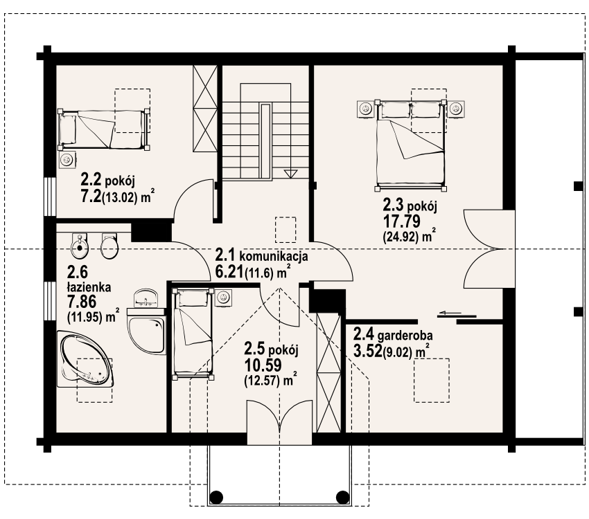 Dom z bali drewnianych. Duży salon z aneksem kuchennym, kominkiem, wyjściem na zadaszony taras, schodami na poddasze. Pokój, wiatrołap, łazienka i kotłownia. Na poddaszu trzy pokoje, łazienka, garderoba i komunikacja. Dwa balkony. Zwarta bryła budynku i dach dwuspadowy sprzyjają taniej i szybkiej budowie oraz niskim kosztom eksploatacji.