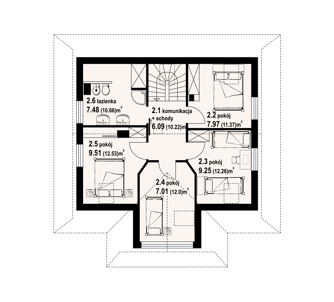 Dom z bali drewnianych. Duży salon z aneksem kuchennym, kominkiem, wyjściem na zadaszony taras, pokój, łazienka, komunikacja i wiatrołap. Na poddaszu trzy pokoje, łazienka, komunikacja, garderoba i dwa balkony. Zwarta bryła budynku i dach dwuspadowy sprzyjają szybkiej taniej budowie i niskim kosztom eksploatacji.