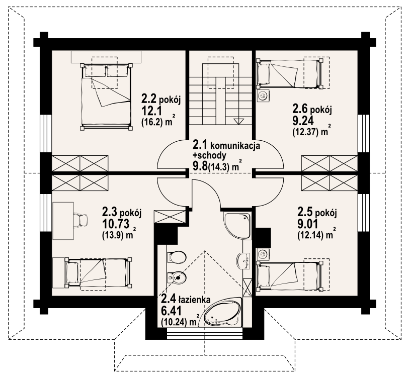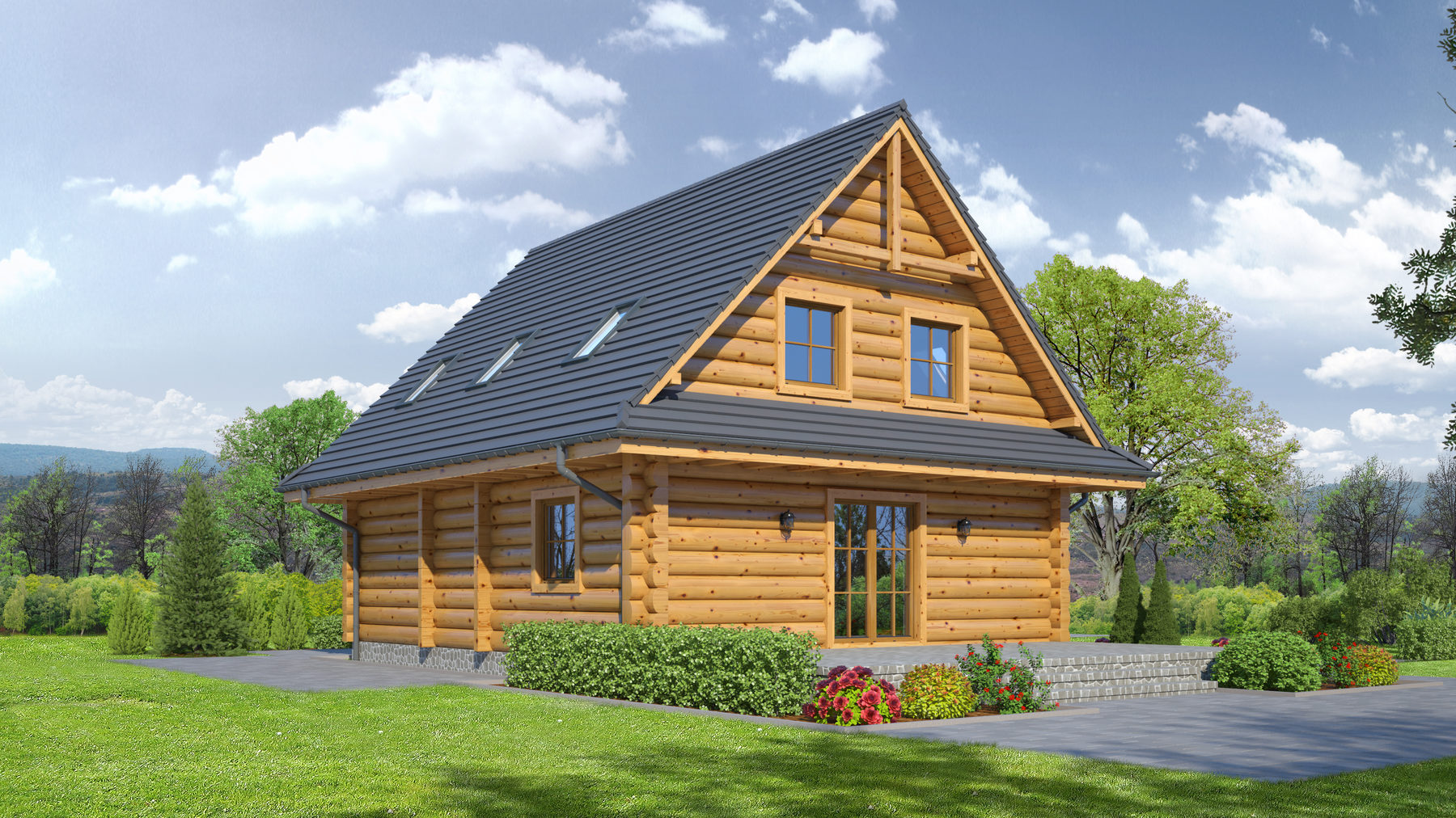 Dom z bali drewnianych. Duży salon z aneksem kuchennym, kominkiem i wyjściem na taras. Pokój, łazienka, komunikacja, wiatrołap, kotłownia. Na poddaszu cztery pokoje, łazienka i komunikacja. Zwarta bryła budynku i dach dwuspadowy sprzyjają szybkiej i taniej budowie i niskim kosztom eksploatacji.