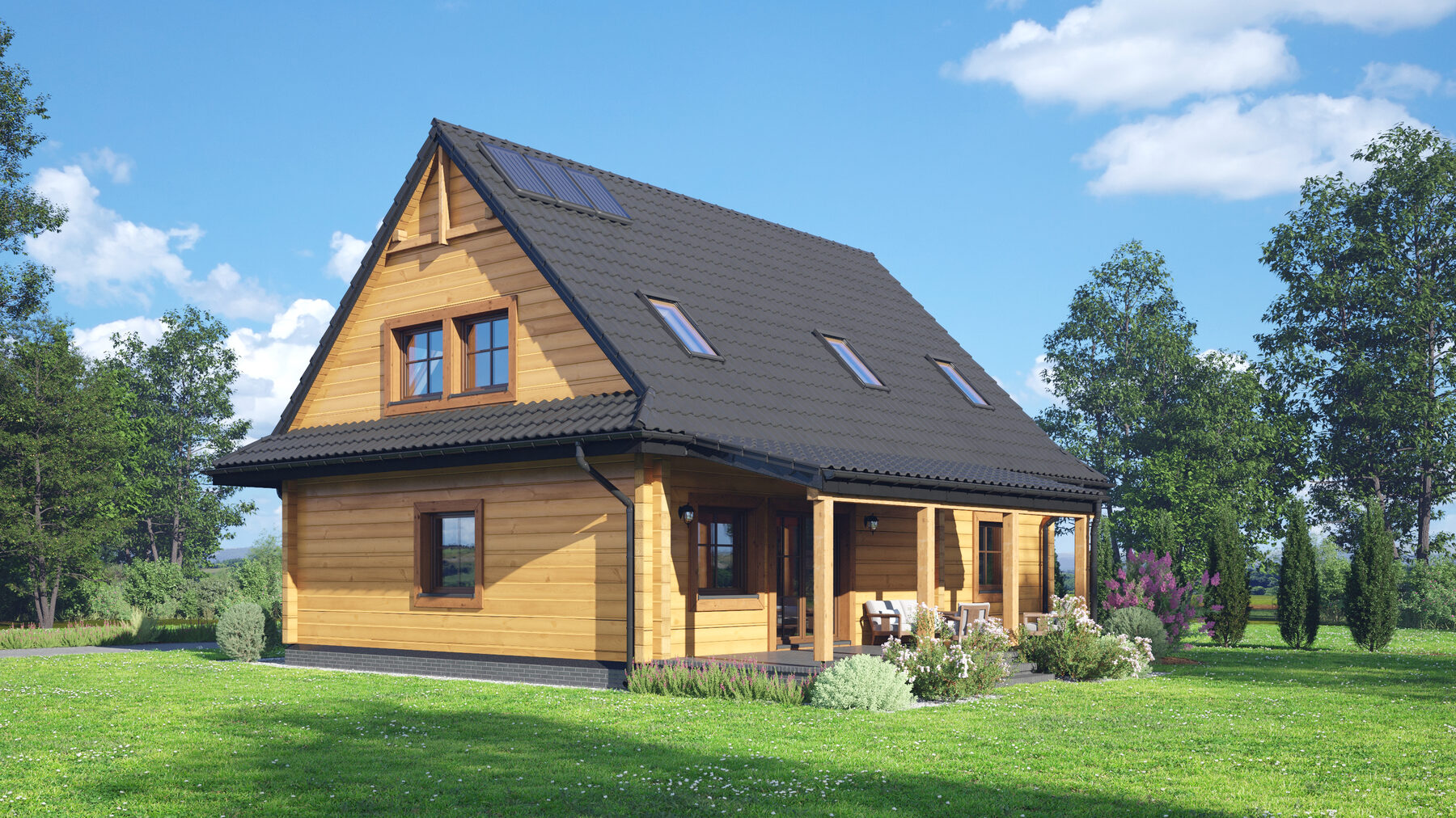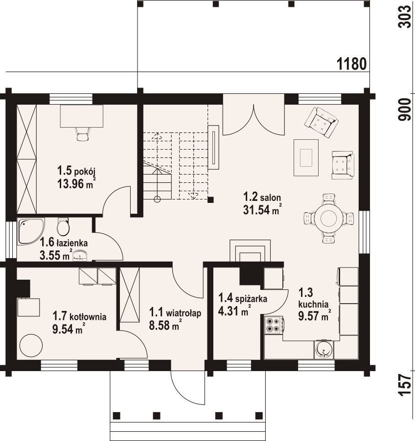Dom z bali z poddaszem użytkowym. Na parterze salon z aneksem kuchennym, kominkiem oraz wyjściem na duży zadaszony taras. Pokój, spiżarka, łazienka, kotłownia, wiatrołap. Na poddaszu cztery pokoje, łazienka, komunikacja. Zwarta bryła budynku oraz dach dwuspadowy sprzyjają szybkiej i taniej budowie oraz niskim kosztom eksploatacji.