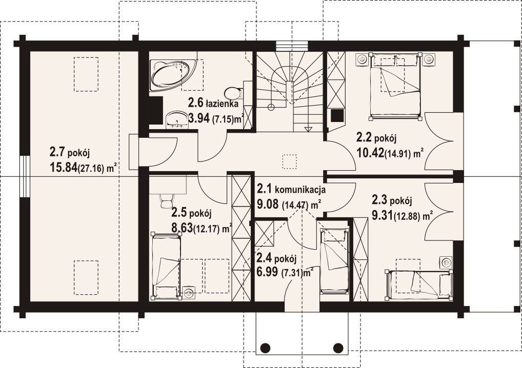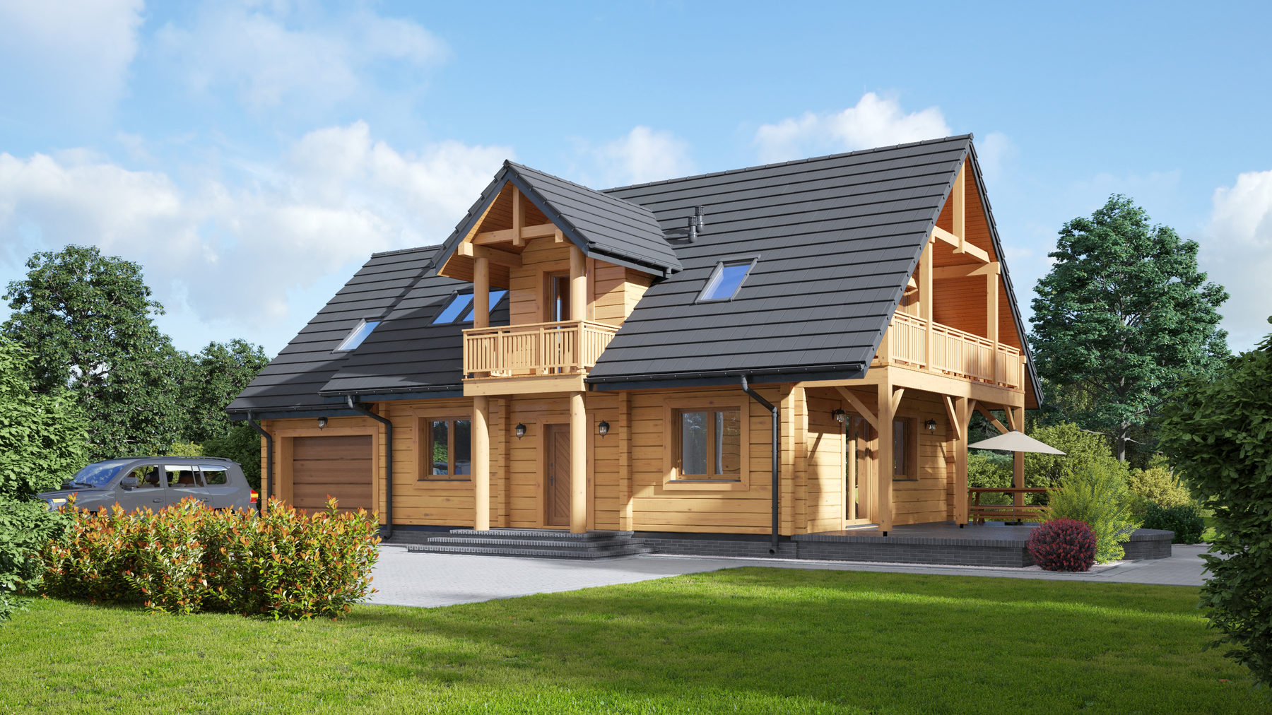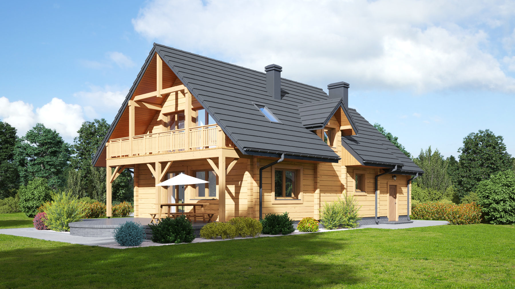 Dom z bali drewnianych. Sześć pokoi, dwie łazienki, aneks kuchenny, wiatrołap, kotłownia, garaż. Duży salon z aneksem kuchennym, kominkiem, schodami na poddasze i wyjściem na taras. Pięć pokoi na poddaszu (w tym trzy z balkonem). Instalacja solarna. Liczne warianty projektu.