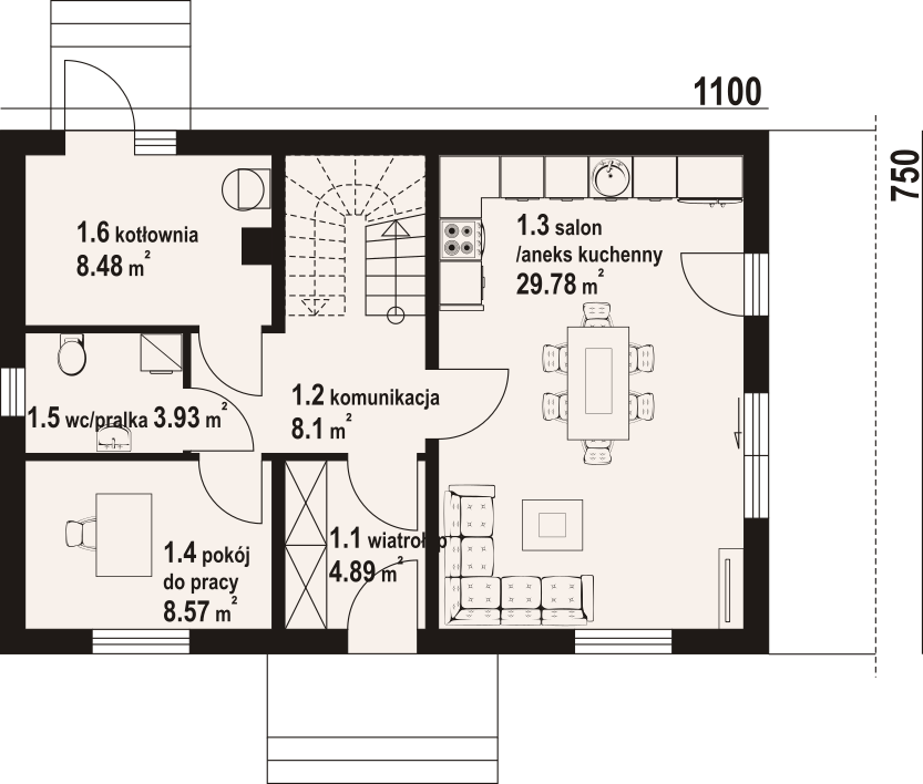 Dom w konstrukcji szkieletu drewnianego. Na parterze salon z aneksem kuchennym oraz wyjściem na taras. Pokój do pracy, wc z pralką, kotłownia, komunikacja, wiatrołap. Na poddaszu cztery pokoje, łazienka, komunikacja. Zwarta bryła budynku oraz dach dwuspadowy sprzyjają szybkiej i taniej budowie oraz niskim kosztom eksploatacji.