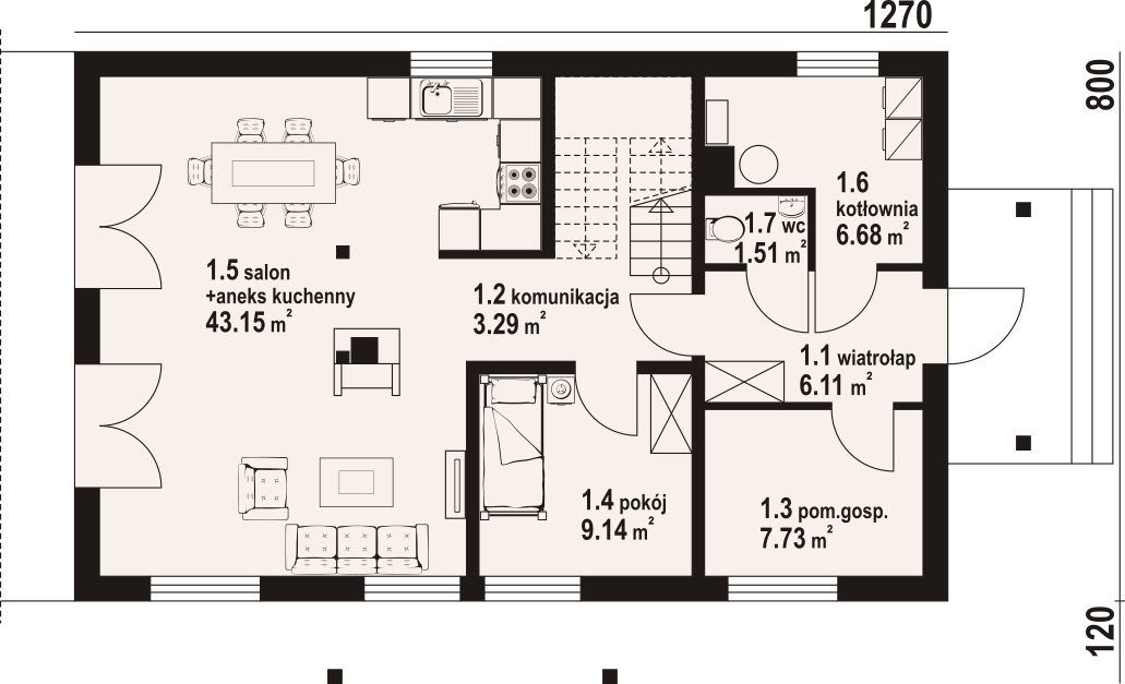 Salon z aneksem kuchennym43,15 m²