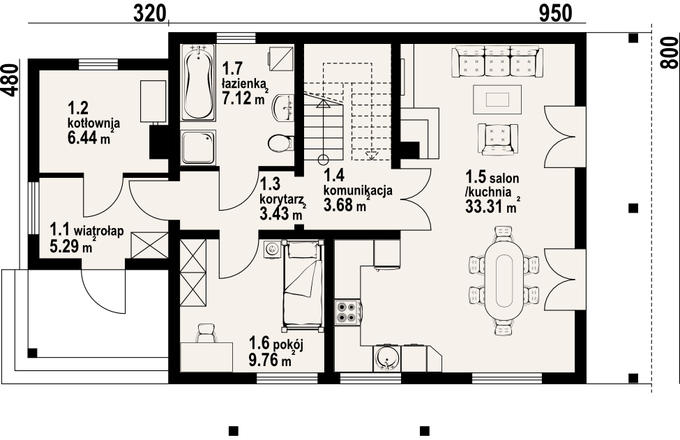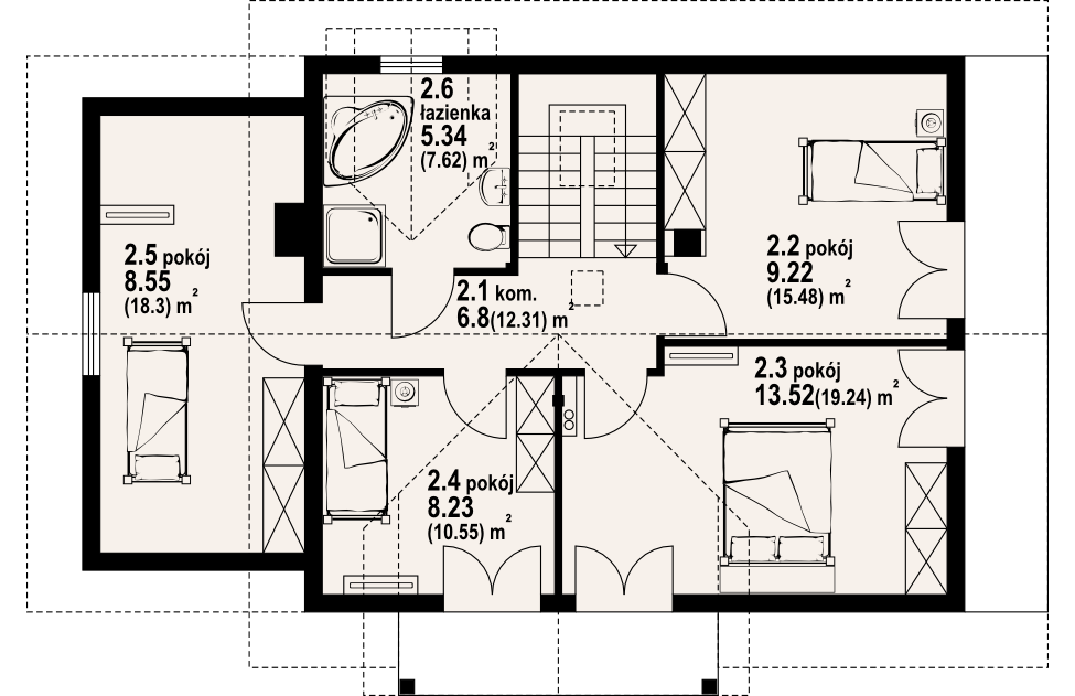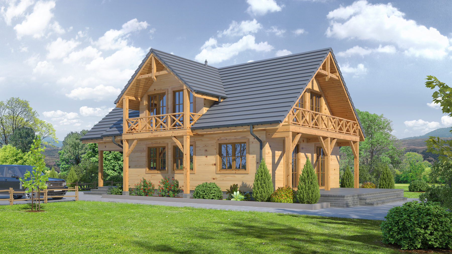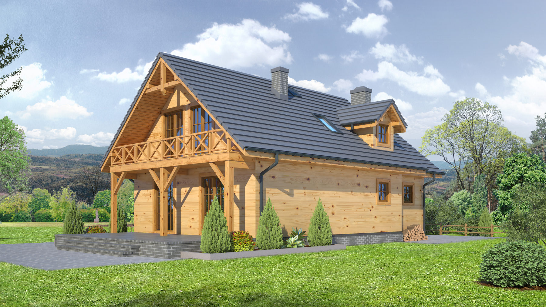 Dom w konstrukcji szkieletu drewnianego. Duży salon z aneksem kuchennym, wyjściem na taras i kominkiem. Pokój, łazienka, komunikacja, kotłownia i wiatrołap. Na poddaszu cztery pokoje, łazienka i komunikacja. Dwa balkony. Zwarta bryła budynku sprzyja szybkiej budowie i niskim kosztom eksploatacji.