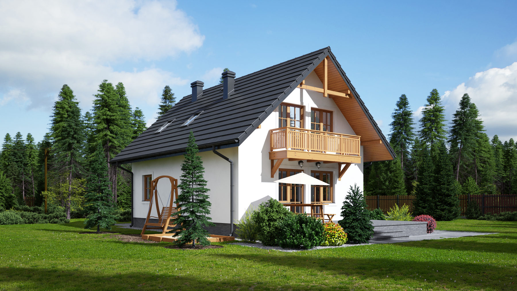 Mały a zarazem funkcjonalny dom parterowy z poddaszem mieszkalnym. Na parterze kuchnia połączona z salonem i dodatkowy pokój, ponadto łazienka i garderoba. Kominek w salonie. Na poddaszu trzy sypialnie, w tym dwie z wyjściem na balkon oraz łazienka. Niskie koszty budowy i eksploatacji.