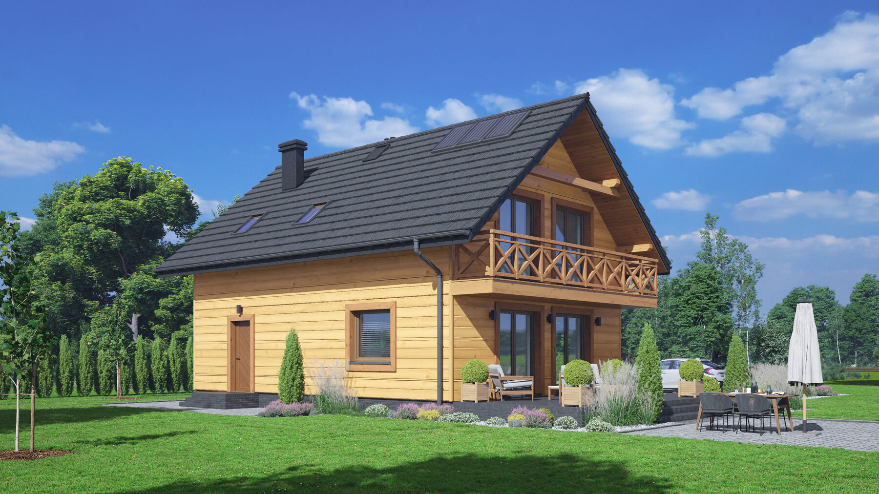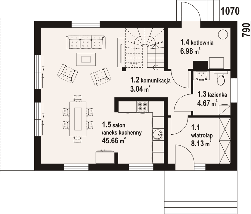 Dom w konstrukcji szkieletu drewnianego. Na parterze salon z aneksem kuchennym, wyjściem na taras i schodami na poddasze. Kotłownia, łazienka, wiatrołap. Na poddaszu cztery pokoje, łazienka, komunikacja oraz balkon dostępny z dwóch pokoi. Zwarta bryła budynku oraz dach dwuspadowy sprzyjają szybkiej i taniej budowie oraz niskim kosztom eksploatacji.