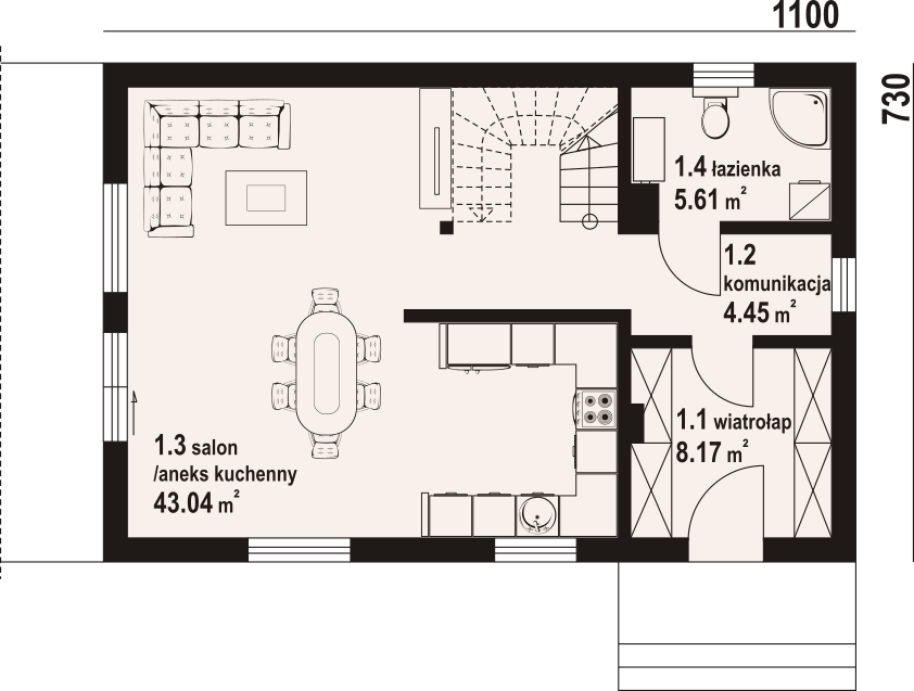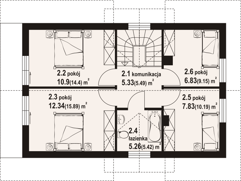 Dom w konstrukcji szkieletu drewnianego. Na parterze salon z aneksem kuchennym, wyjściem na taras i schodami na poddasze. Łazienka, komunikacja, wiatrołap. Na poddaszu cztery pokoje, łazienka, komunikacja oraz balkon dostępny z dwóch pokoi. Zwarta bryła budynku oraz dach dwuspadowy sprzyjają szybkiej i taniej budowie oraz niskim kosztom eksploatacji.