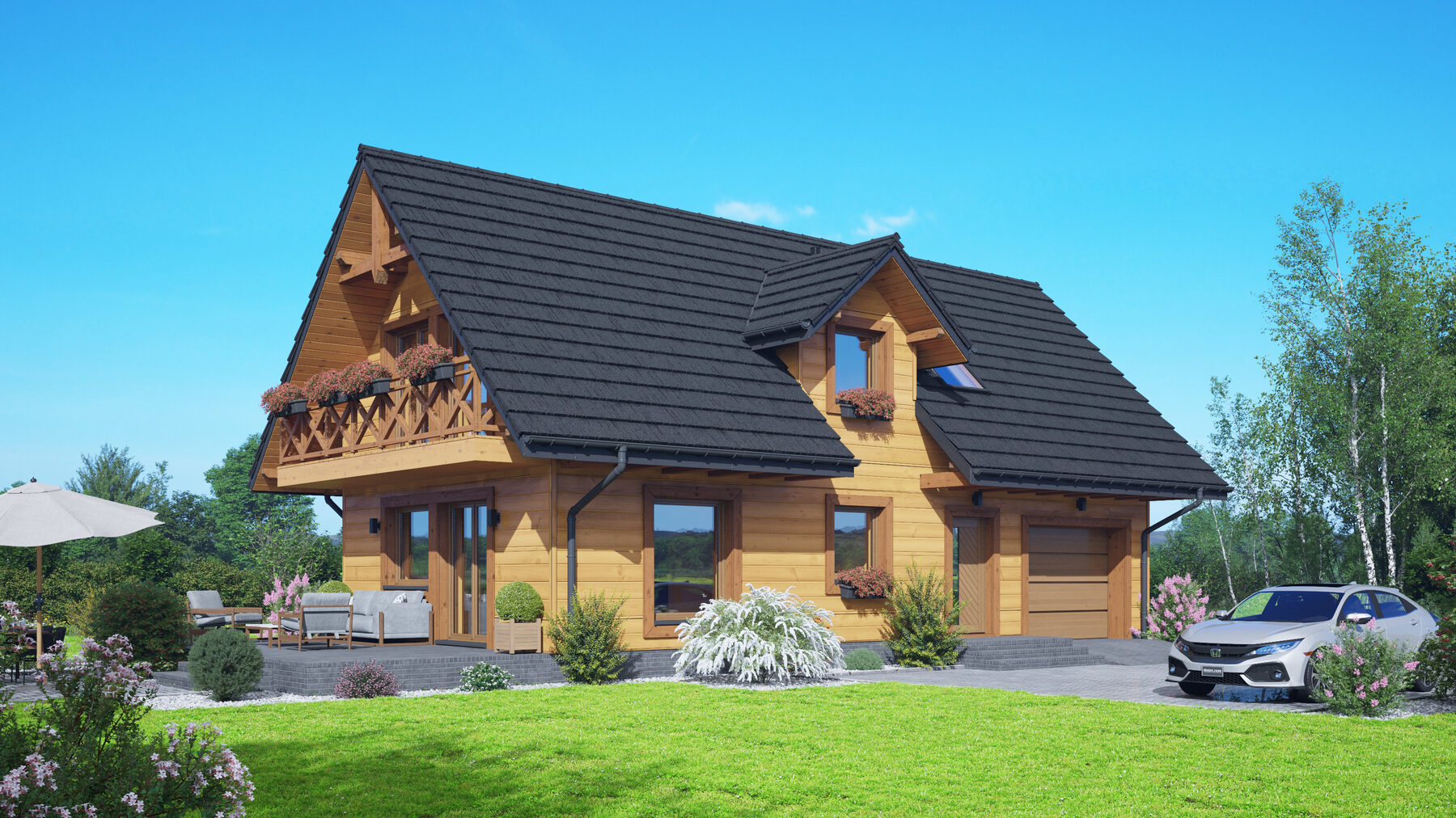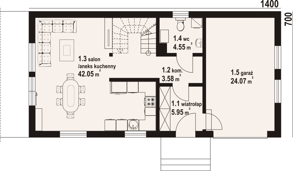 Dom w konstrukcji szkieletu drewnianego. Na parterze salon z aneksem kuchennym, wyjściem na taras i schodami na poddasze. WC, komunikacja, wiatrołap oraz garaż. Na poddaszu cztery pokoje, komunikacja, łazienka, garderoba oraz balkon dostępny z dwóch pokoi. Zwarta bryła budynku oraz dach dwuspadowy sprzyjają szybkiej i taniej budowie oraz niskim kosztom eksploatacji.