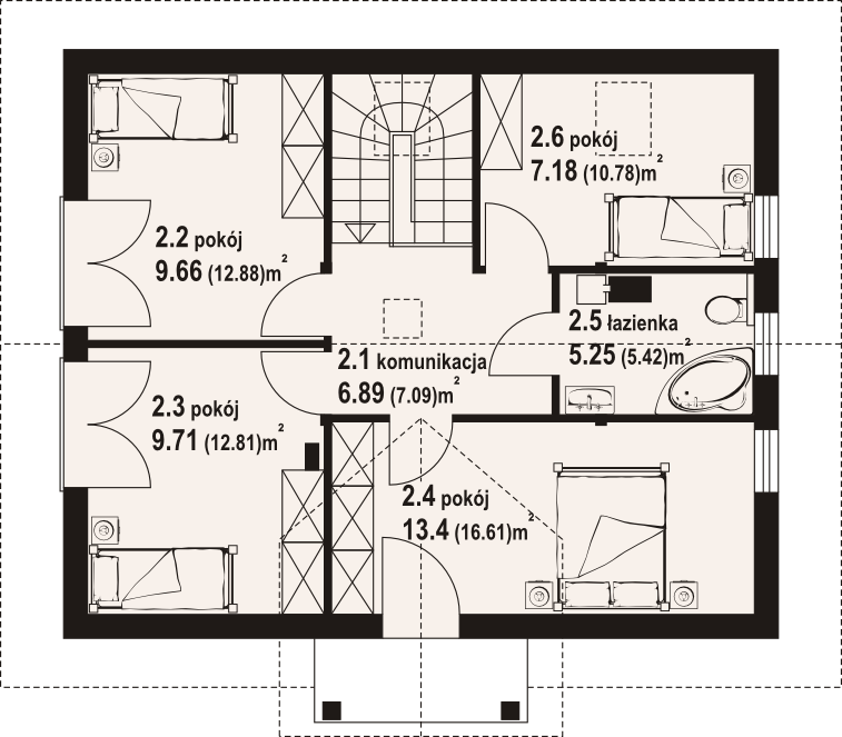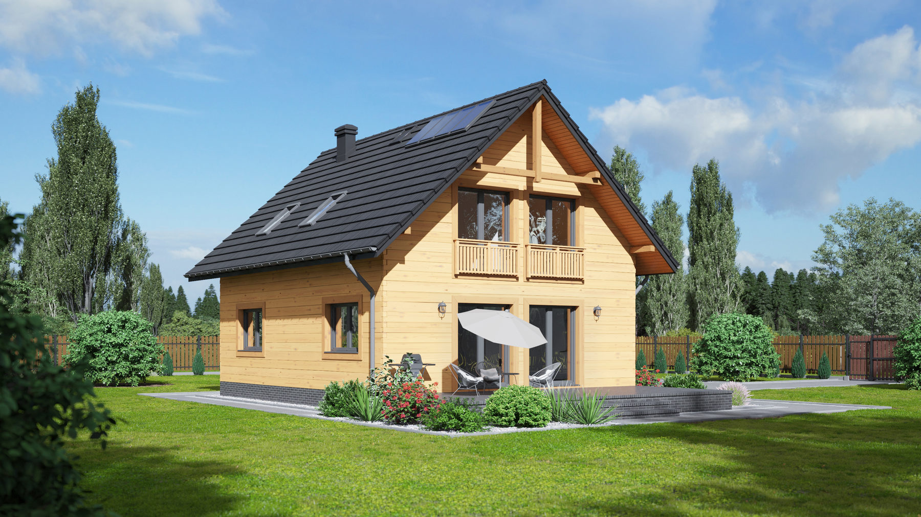 Dom w konstrukcji szkieletu drewnianego. Duży salon z aneksem kuchennym, wyjściami na taras i schodami na poddasze. Dwa pokoje, łazienka i wiatrołap. Na poddaszu cztery pokoje, łazienka, komunikacja i balkon. Zwarta bryła budynku sprzyja szybkiej i taniej budowie i niskim kosztom eksploatacji.