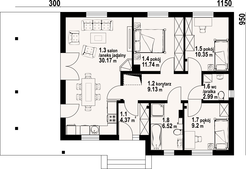 Dom parterowy w konstrukcji szkieletu drewnianego. Duży salon z aneksem kuchennym, kominkiem i wyjściem na zadaszony taras. Trzy pokoje, łazienka, wc z pralką, korytarz i wiatrołap. W korytarzu schody rozkładane na strych. Strych nieużytkowy.