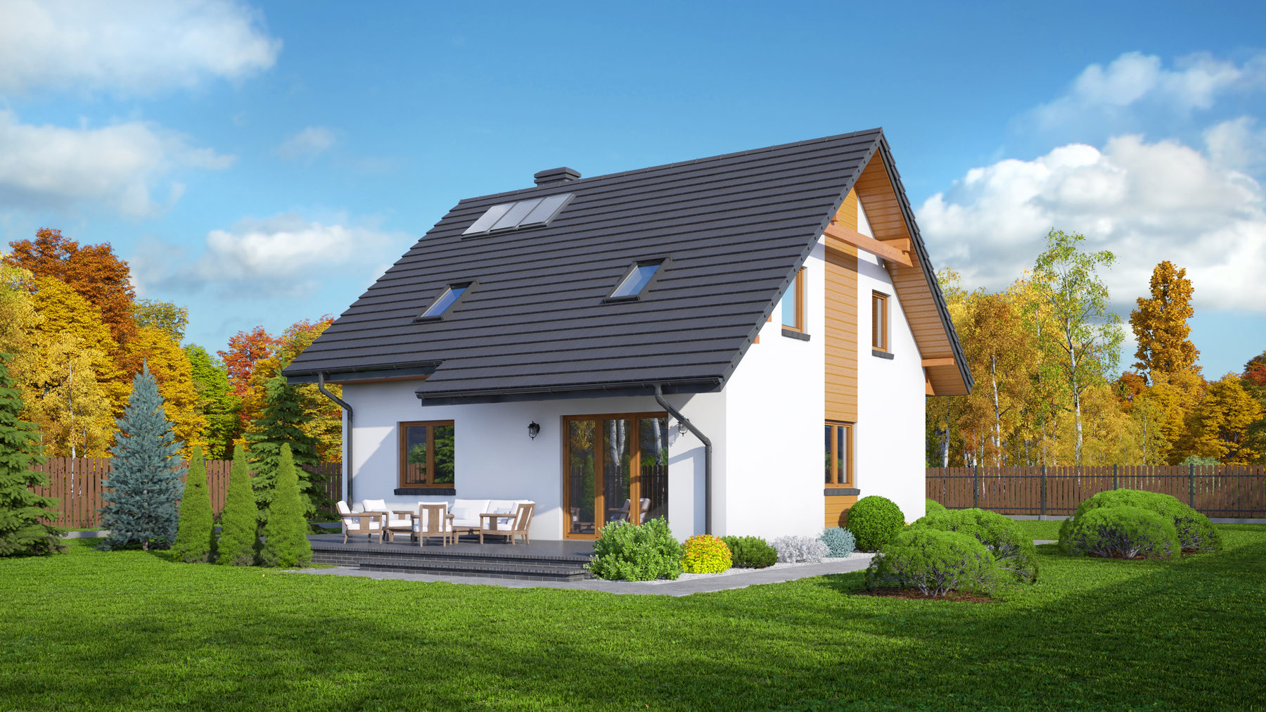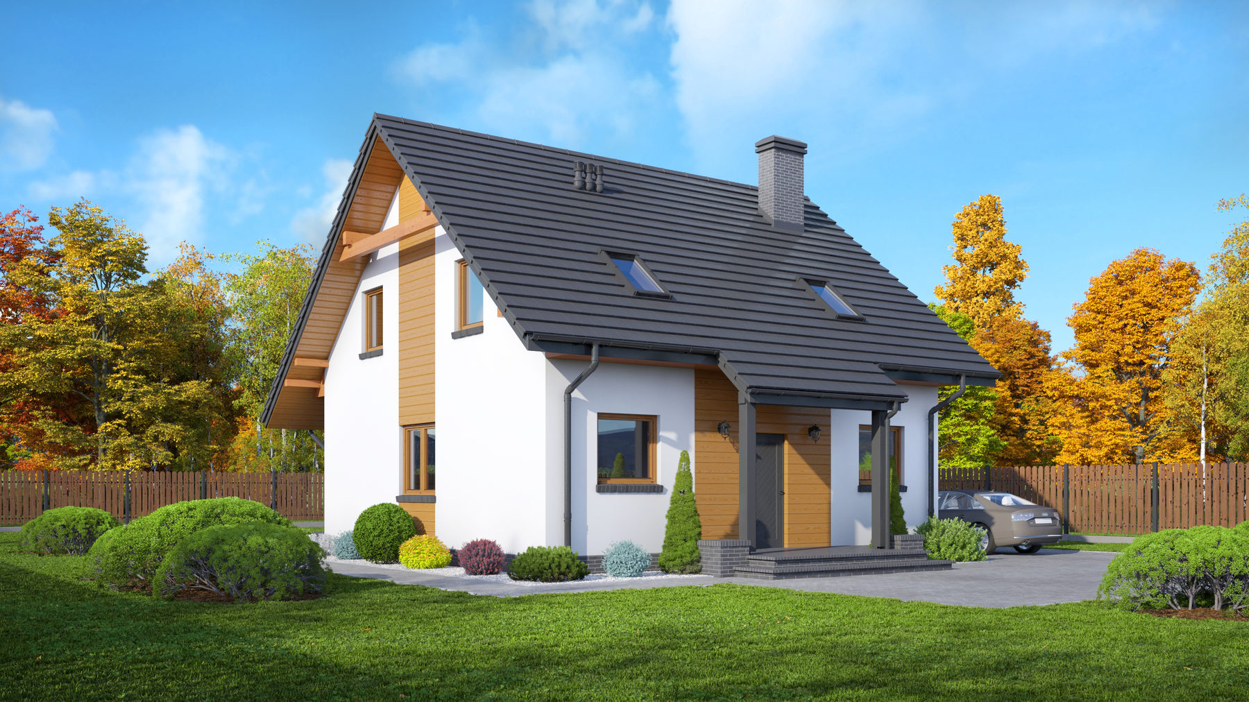Dom w konstrukcji szkieletu drewnianego. Duży salon z aneksem kuchennym i wyjściem na taras. Pokój, łazienka, spiżarka, kotłownia i wiatrołap. Na poddaszu trzy pokoje, łazienka i komunikacja. Zwarte bryła budynku i dach dwuspadowy sprzyjają szybkiej i taniej budowie oraz niskim kosztom eksploatacji.