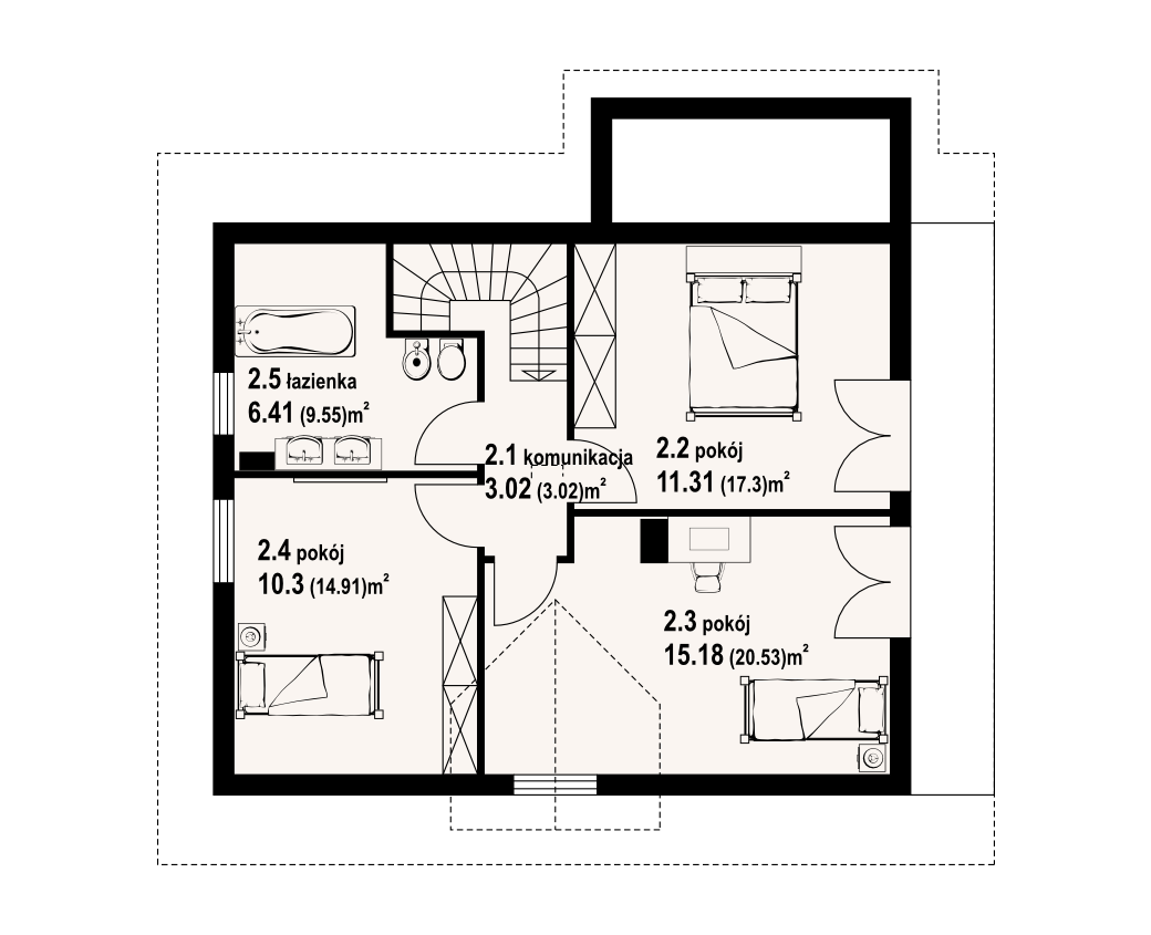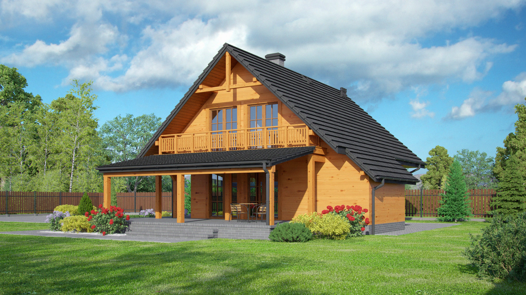 Dom w konstrukcji szkieletu drewnianego. Duży salon z aneksem kuchennym, kominkiem, wyjściem na zadaszony taras i schodami na poddasze. Łazienka, kotłownia i wiatrołap. Na poddaszu trzy pokoje, łazienka, komunikacja i balkon. Zwarta bryła budynku i dach dwuspadowy sprzyjają szybkiej i taniej budowie i niskim kosztom eksploatacji.