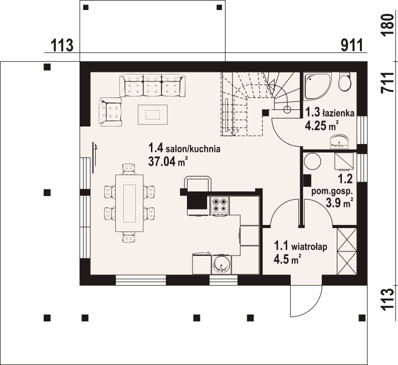 Dom w konstrukcji szkieletu drewnianego. Na parterze duży salon z aneksem kuchennym, kominkiem, schodami na poddasze oraz wyjściem na taras. Łazienka, pomieszczenie gospodarcze, wiatrołap. Na poddaszu trzy pokoje, łazienka, komunikacja i balkon. Zwarta bryła budynku oraz dach dwuspadowy sprzyjają szybkiej i taniej budowie oraz niskim kosztom eksploatacji.