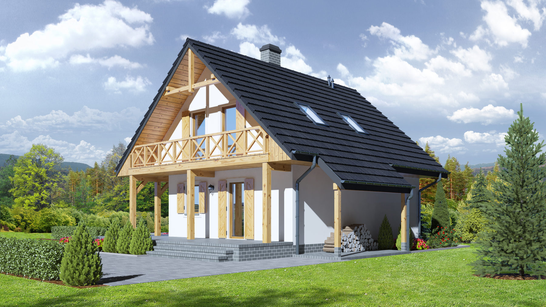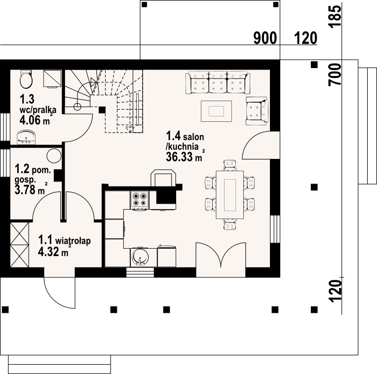 Dom w konstrukcji szkieletu drewnianego. Duży salon z aneksem kuchennym, kominkiem, wyjściami na taras i schodami na poddasze. Łazienka, pomieszczenie gospodarcze, wiatrołap. Na poddaszu trzy pokoje, komunikacja i balkon. Prosta bryła budynku i dach dwuspadowy sprzyjają szybkiej i taniej budowie i niskim kosztom eksploatacji.