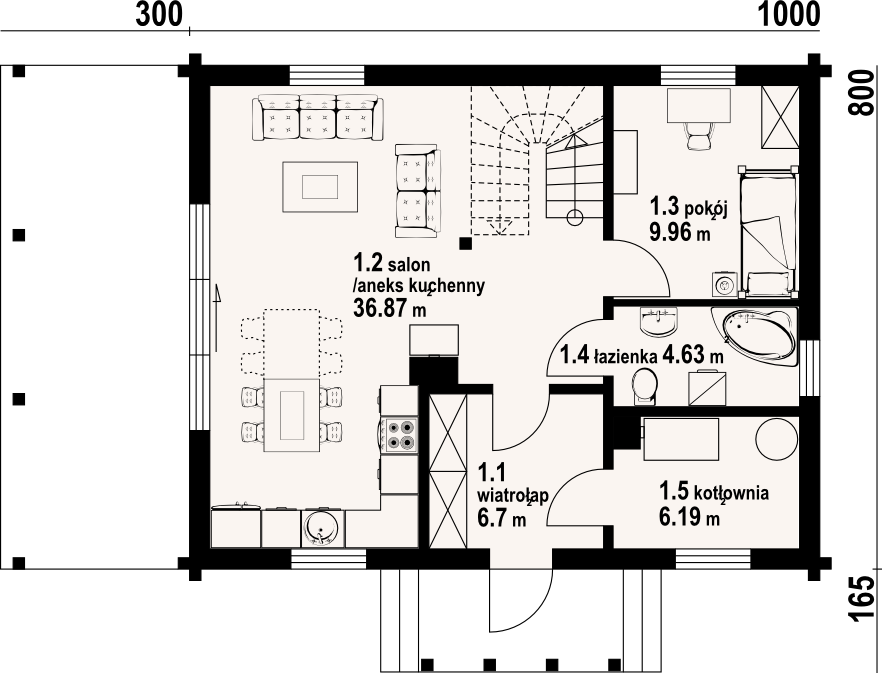 Dom z bali drewnianych. Na parterze duży salon z aneksem kuchennym, kominkiem i wyjściem na zadaszony taras. Pokój, łazienka, kotłownia, wiatrołap. Na poddaszu trzy pokoje, łazienka, komunikacja. Zwarta bryła budynku i dach dwuspadowy sprzyjają szybkiej i taniej budowie i niskim kosztom eksploatacji.