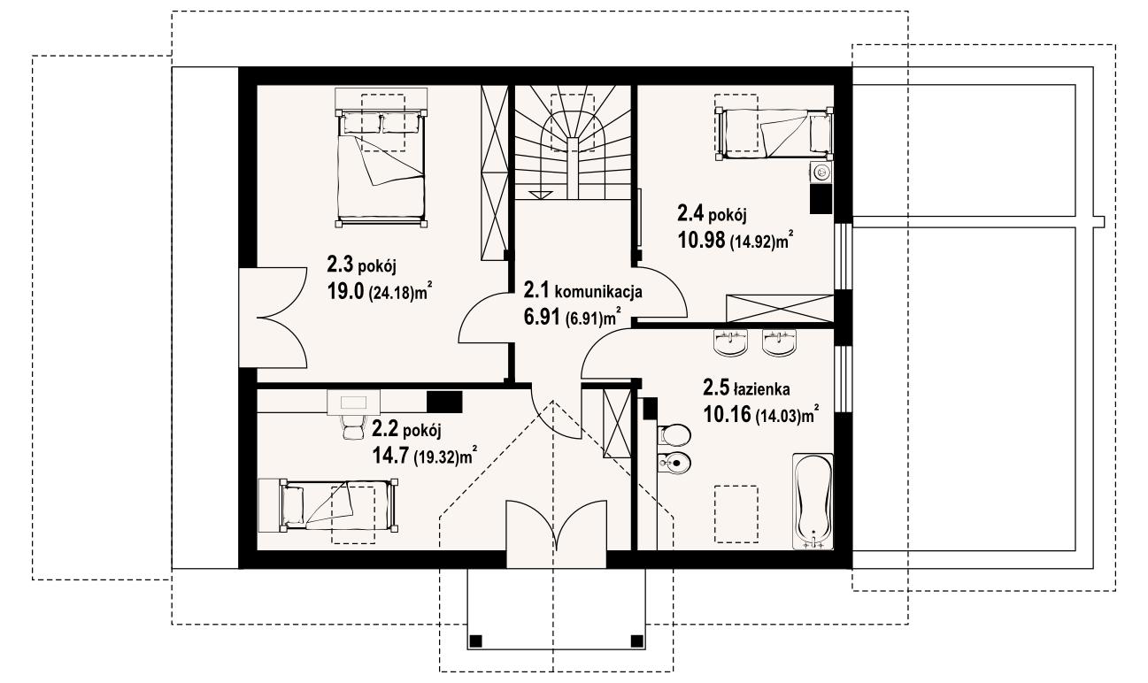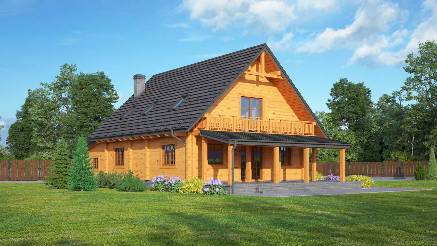 Dom drewniany z bali. Duży salon z aneksem kuchennym, łazienką, schodami na poddasze i zadaszonym tarasem. Pokój, łazienka, wiatrołap, korytarz, garaż i kotłownia. Na poddaszu trzy pokoje, łazienka, komunikacja i dwa balkony. Zwarta bryła budynku i dach dwuspadowy sprzyjają taniej i szybkiej budowie oraz niskim kosztom eksploatacji.