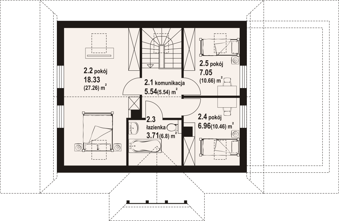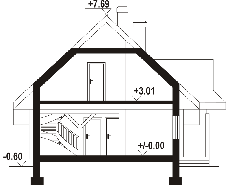 Dom z bali. Na parterze salon z aneksem kuchennym, kominkiem, wyjściem na duży, zadaszony taras oraz schodami na poddasze. Pokój, łazienka, wiatrołap, garaż, dwa pomieszczenia gospodarcze. Na poddaszu trzy pokoje, łazienka, komunikacja. Zwarta bryła budynku oraz dach dwuspadowy sprzyjają szybkiej i taniej budowie oraz niskim kosztom eksploatacji.