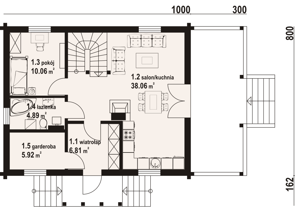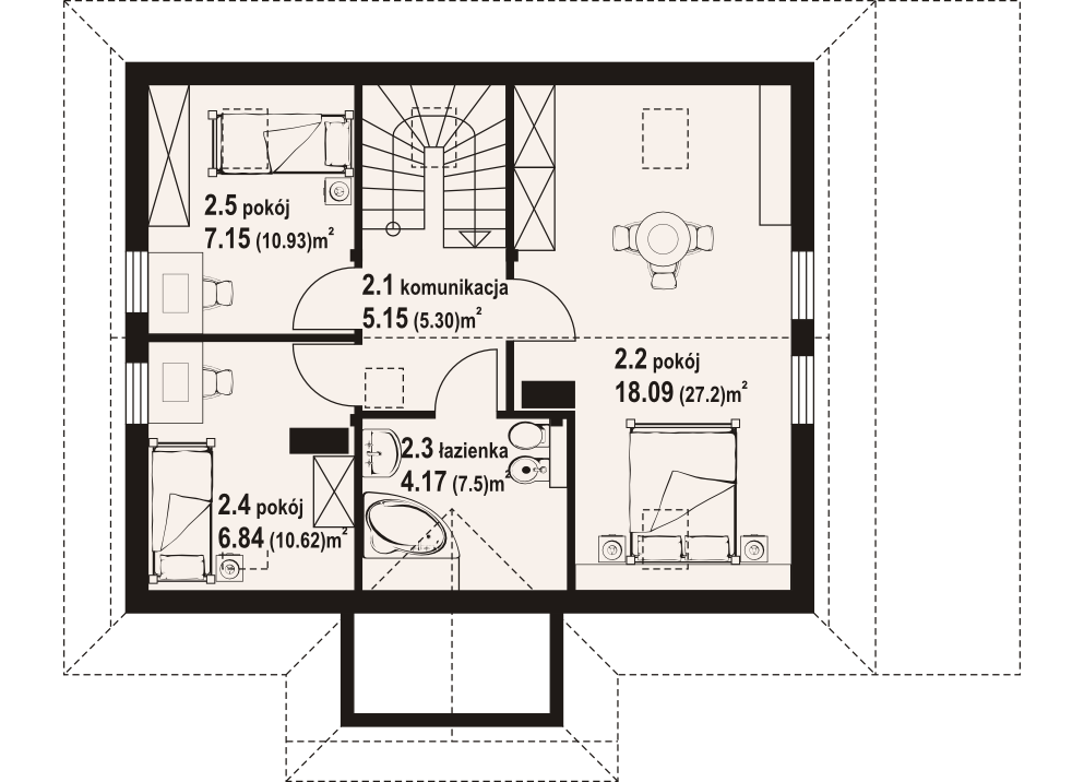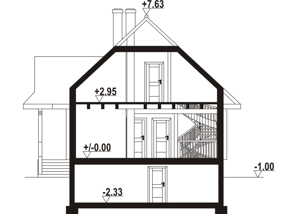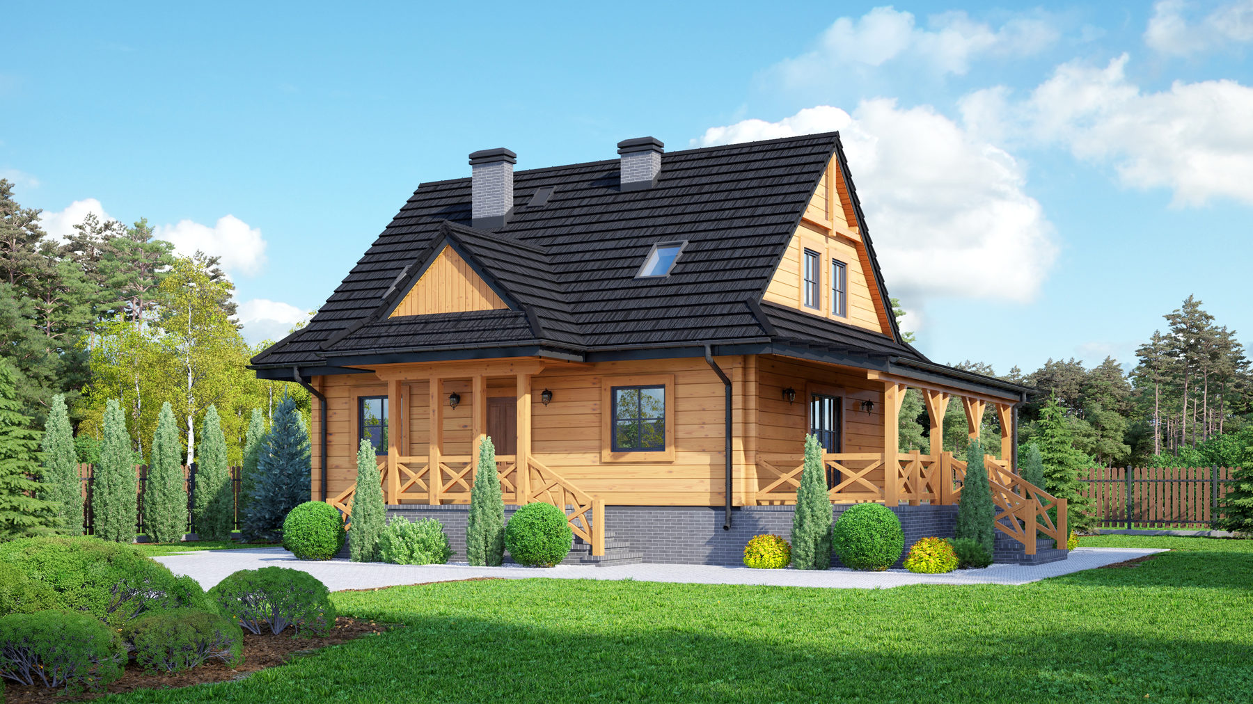 Dom z bali drewnianych. Podpiwniczony. Duży salon z aneksem kuchennym, kominkiem, wyjściem na zadaszony taras i schodami. Pokój, wiatrołap, łazienka, garderoba. Na poddaszu trzy pokoje, łazienka i komunikacja. Zwarta bryła budynku i dach dwuspadowy sprzyjają szybkiej i taniej budowie i niskim kosztom eksploatacji.