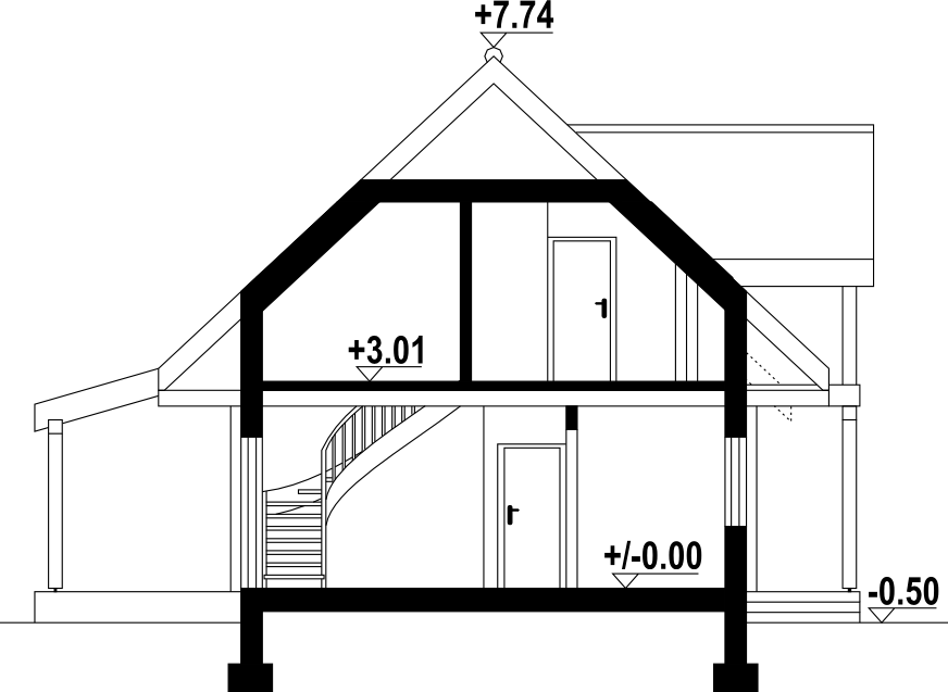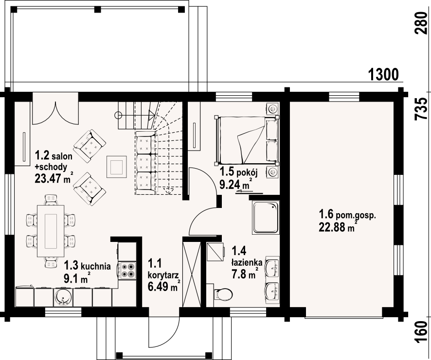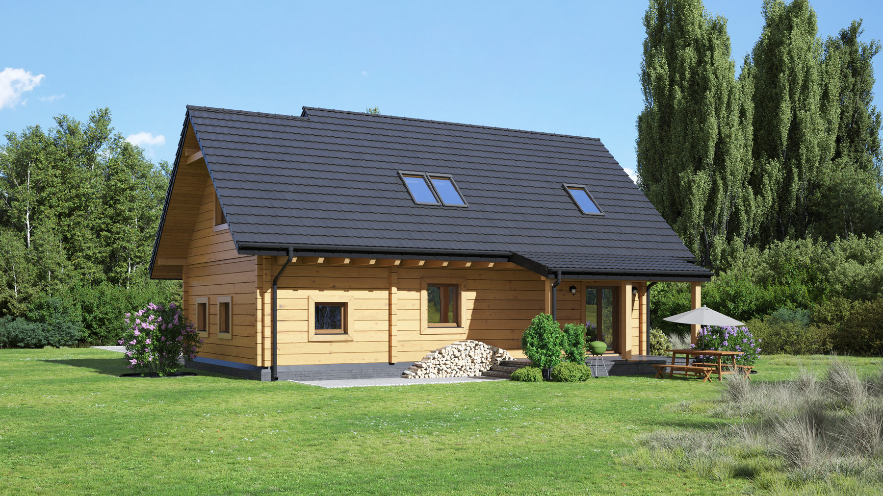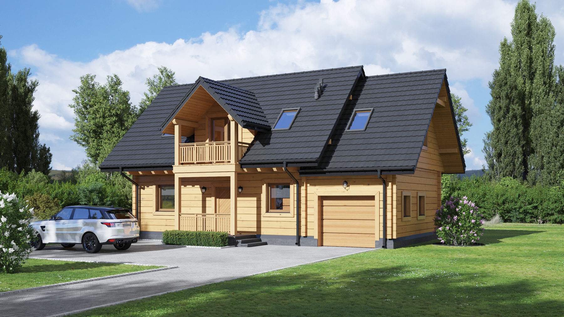Dom z bali. Na parterze duży salon z aneksem kuchennym, schodami na poddasze oraz wyjściem na duży, zadaszony taras. Pokój, łazienka, korytarz oraz pomieszczenie gospodarcze. Na poddaszu trzy pokoje, łazienka, komunikacja oraz strych. Wyjście na balkon z komunikacji. Zwarta bryła budynku i dach dwuspadowy sprzyjają szybkiej i taniej budowie i niskim kosztom eksploatacji.